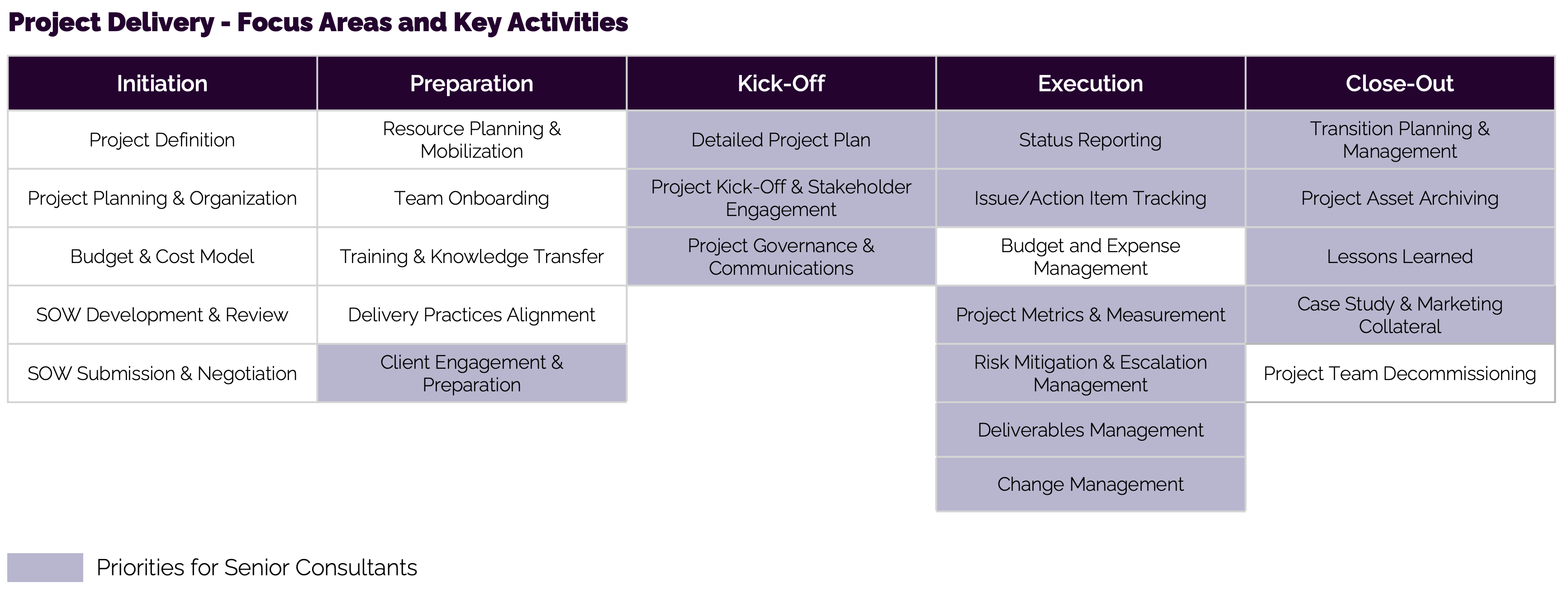 The project delivery capabilities of how consulting firms drive projects end-to-end from initiation to close-out.