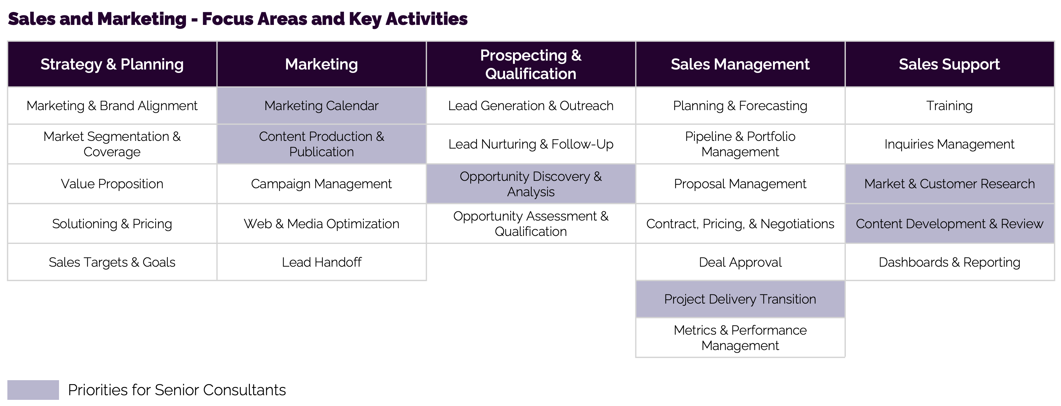 The business development and brand-building capabilities that ultimately grow the firm within existing (inside sales) and net new clients.
